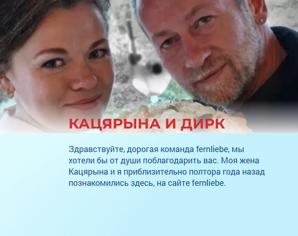 Многие пары, познакомившиеся на сайте международных знакомств fernliebe, не испугались расстояния, различий менталитета и первоначальных трудностей отношений на две страны. Они смогли построить реальные и счастливые отношения! Мы искренне желаем и вам найти свою вторую половинку и обрести счастье вдвоём!